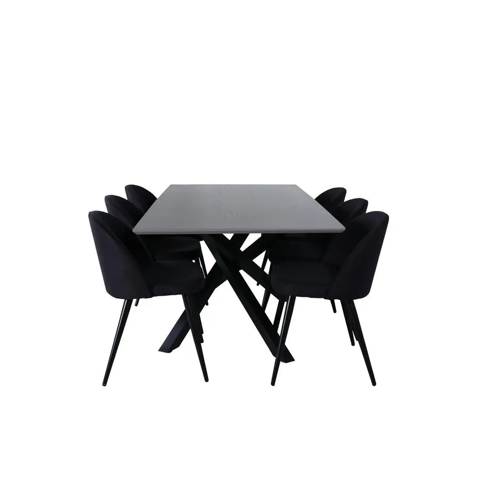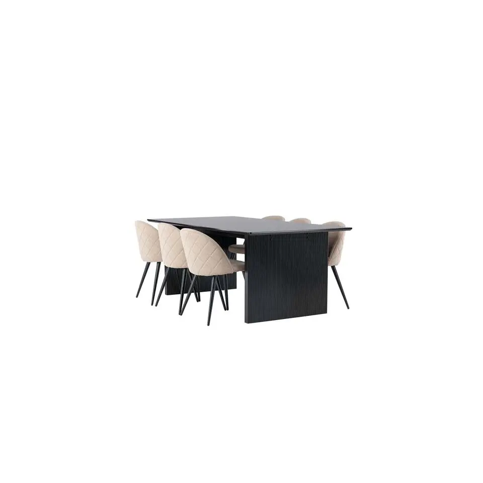 Hioshop Vail eethoek tafel zwart en 6 Velvet stoelen beige