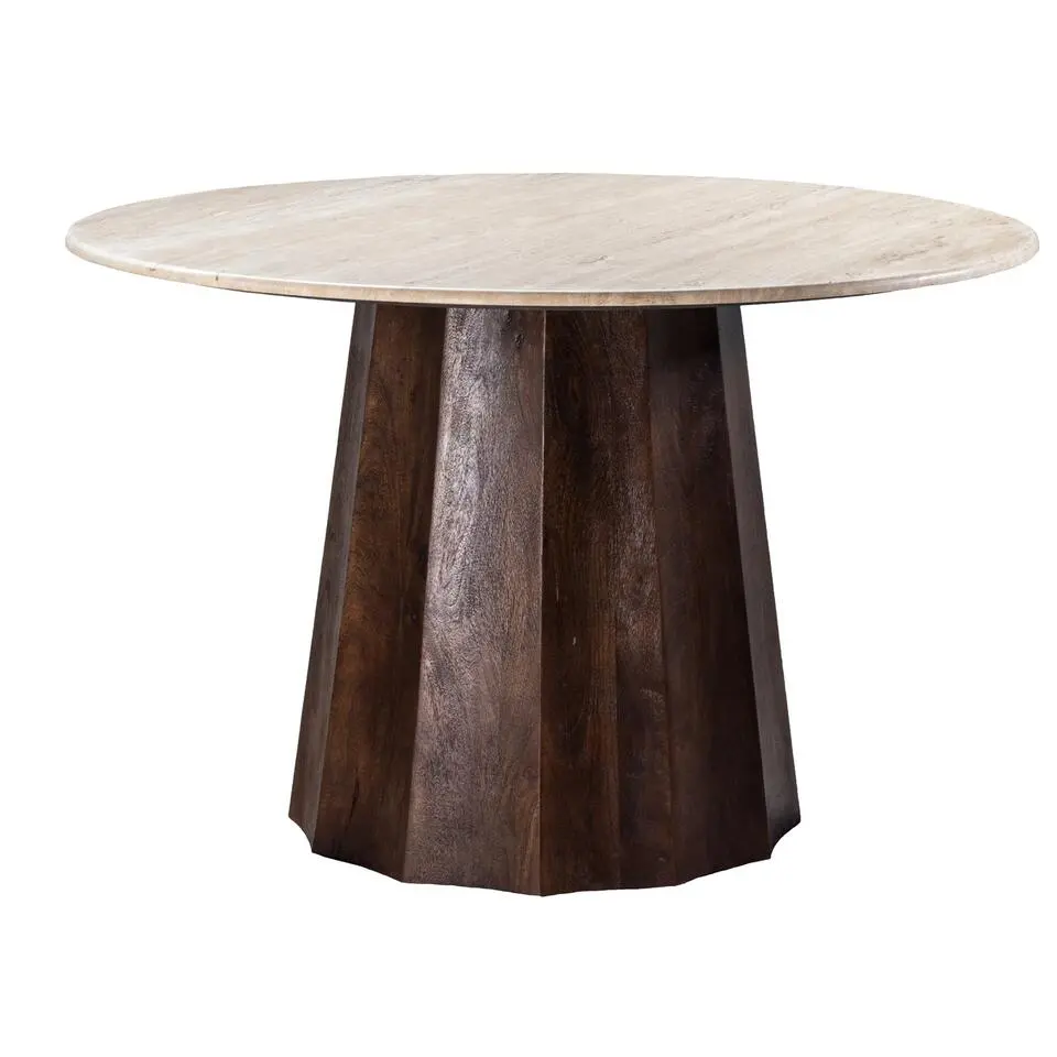 Eettafel Ø120cm - Wit Travertin Blad - Bruin Onderstel