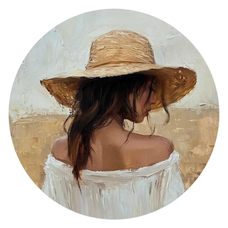 Glasschilderij Onder de strohoed - Ø 70 - Beige
