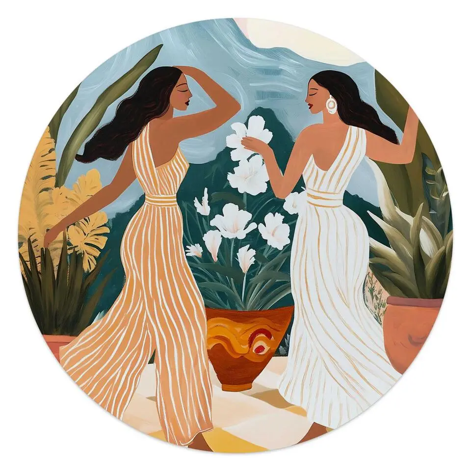 Glasschilderij Dansende dames - Ø 50 - Bont